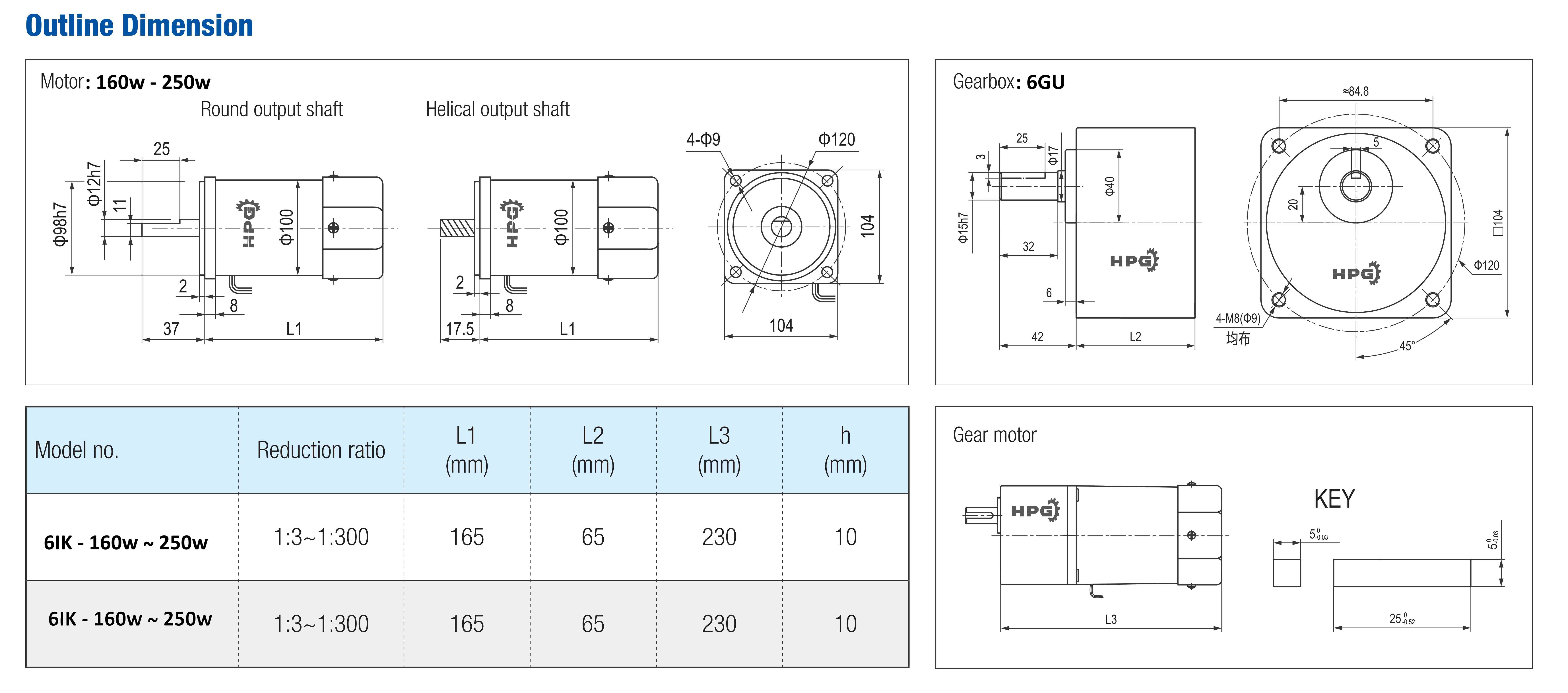 Kích thước động cơ giảm tốc giảm tốc mini từ 160w đến 250w