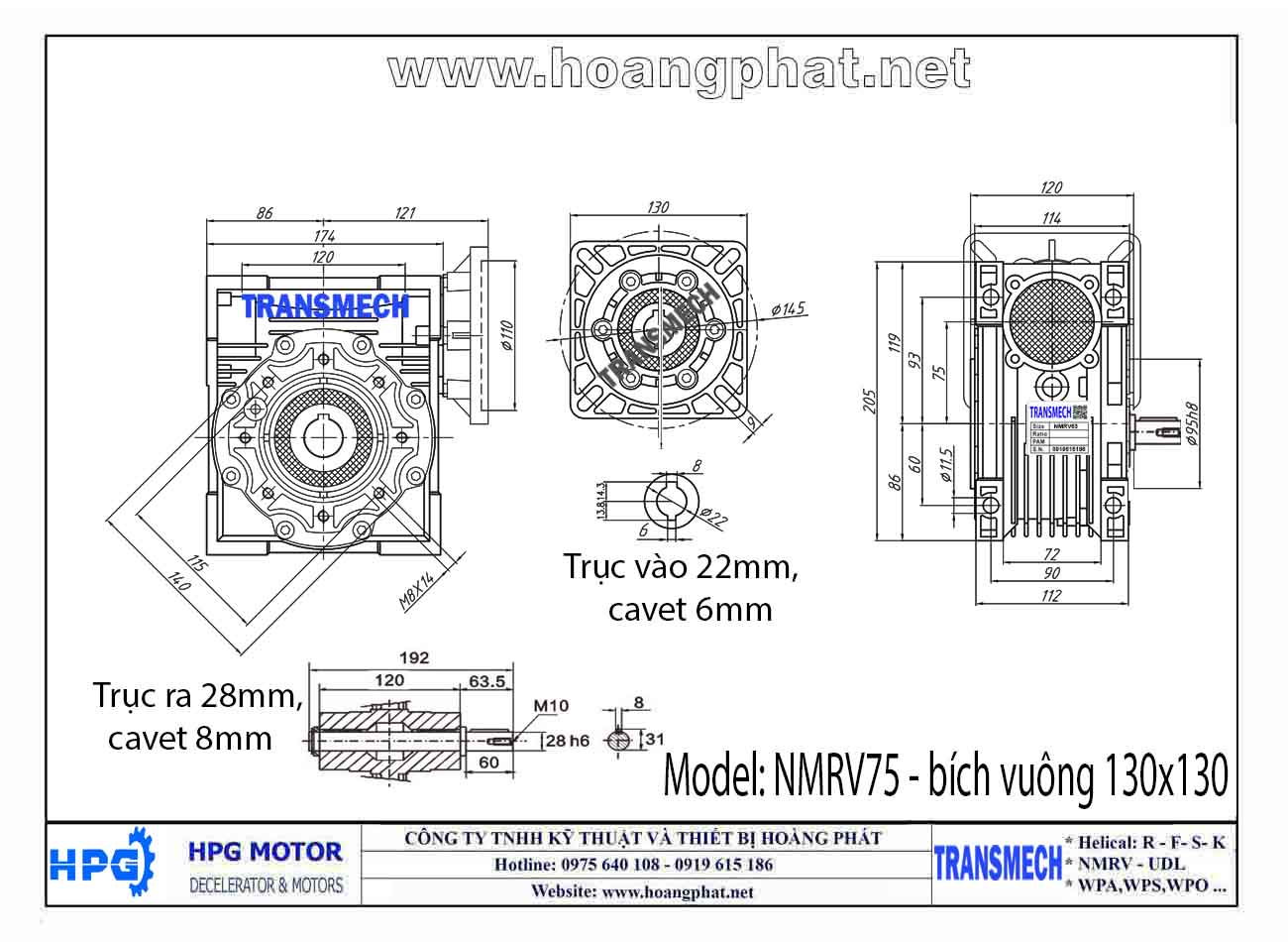 Hộp giảm tốc NMRV75 bích vuông 130x130 trục ra dương 28mm